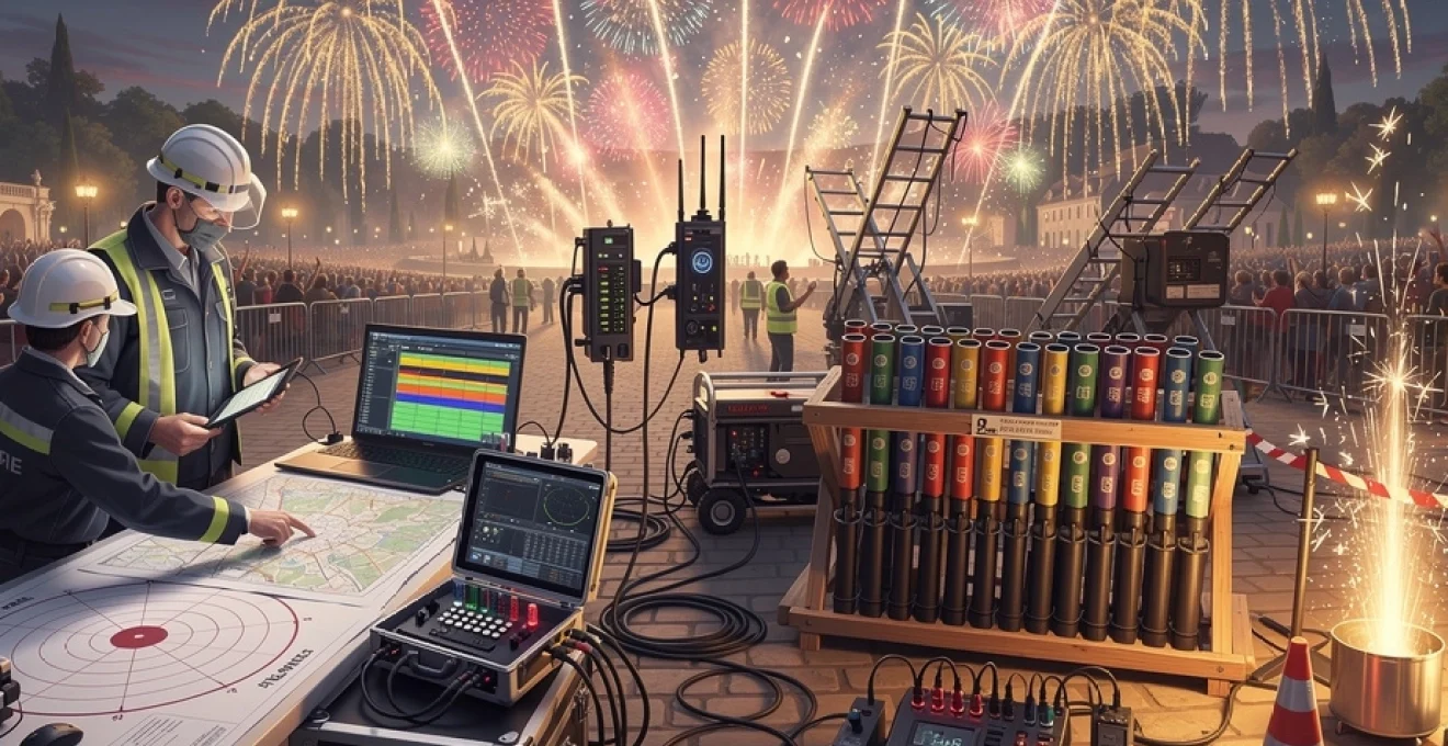 Pour mettre en œuvre cette chorégraphie complexe, la mise à feu électrique s’impose comme la solution la plus sûre et la plus précise. Chaque artifice est équipé d’une amorce électrique reliée à un module de tir, lui-même piloté par une centrale informatique. Les systèmes modernes intègrent des modules sans fil qui communiquent par radio, ce qui réduit la quantité de câbles à déployer sur le terrain et facilite l’implantation sur des structures éloignées (toits, pontons, barges flottantes). Comme pour un orchestre dirigé par un chef, la centrale de tir envoie à chaque module l’ordre exact au moment voulu, en suivant le script programmé à l’avance.
